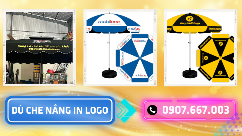 Dù thiết kế in logo quảng cáo theo yêu cầu cũng là một sản phẩm cực kỳ thịnh hành trên địa bàn tỉnh. Đây là một trong những mẫu sản phẩm vừa có tác dụng như một chiếc dù che nắng. Lại mang sứ mệnh quảng bá và tăng khả năng nhận diện thương hiệu cho khách hàng. Chi phí để thiết kế in lên mái dù cũng không phải là quá lớn. Vậy nên nhiều người khi tìm mua đến những sản phẩm này thường sẽ có nhu cầu đặt in luôn các thông tin của công ty và doanh nghiệp.