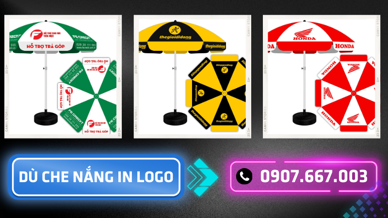 Chi phí để thiết kế và in sẵn logo hoặc tên thương hiệu lên mái của dù che nắng cũng không phải quá lớn. Nhiều doanh nghiệp sẽ tận dụng nguồn lực và thiết kế ra những mẫu dù được gắn sẵn logo hoặc tên thương hiệu của mình. Điều này có tác động khá lớn trong việc tiếp thị thương hiệu của doanh nghiệp đến người tiêu dùng.